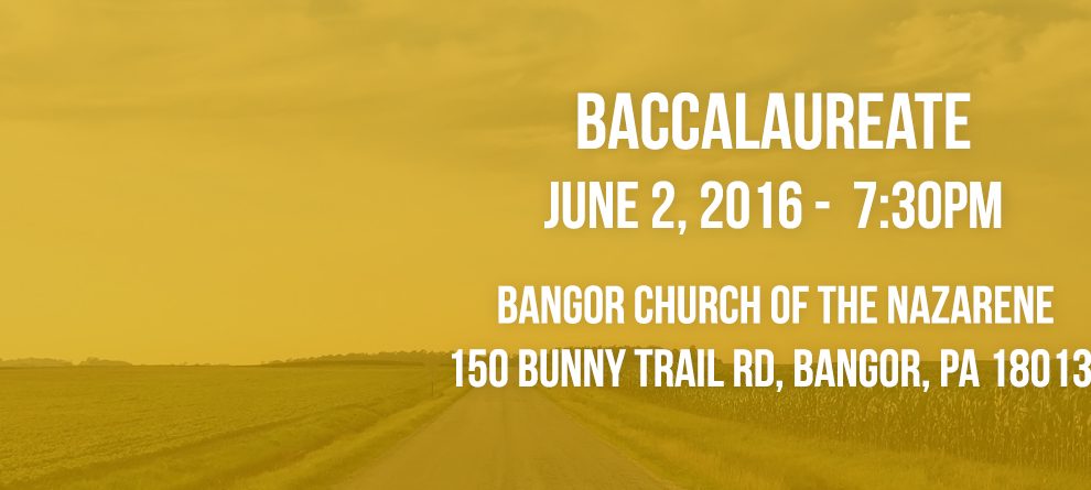 Baccalaureate will be held on June 2, 2016 at 7:30pm at Bangor Church of the Nazarene, 150 Bunny Trail Rd, Bangor, PA 18013.