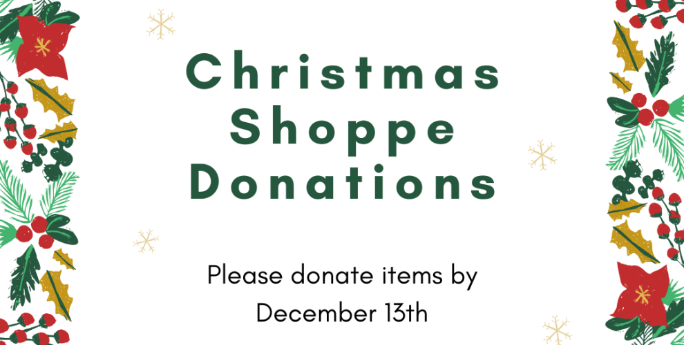 CHRISTMAS SHOPPE Dec 14th & Dec 15th All students in K-12th Grade will have the opportunity to shop for their family, friends and pets at our Annual Christmas Shoppe! Like in years past, we will be collecting donated items to be sold at our sale.